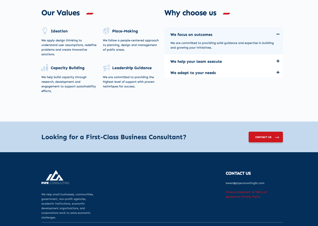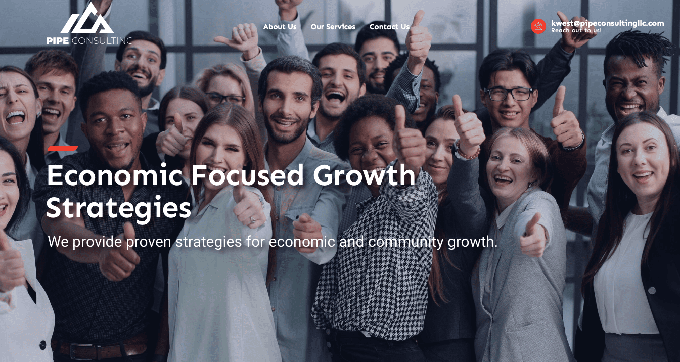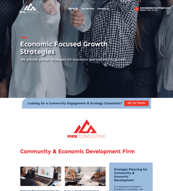 This project was designed to showcase the services for Pipe Consulting, LLC. PIPE Consulting LLC is a premier community and economic development firm that provides strategy consulting to help communities and cities thrive. Pipe’s mission is to help optimize and improve economic conditions by providing technical assistance to address and overcome challenges.
